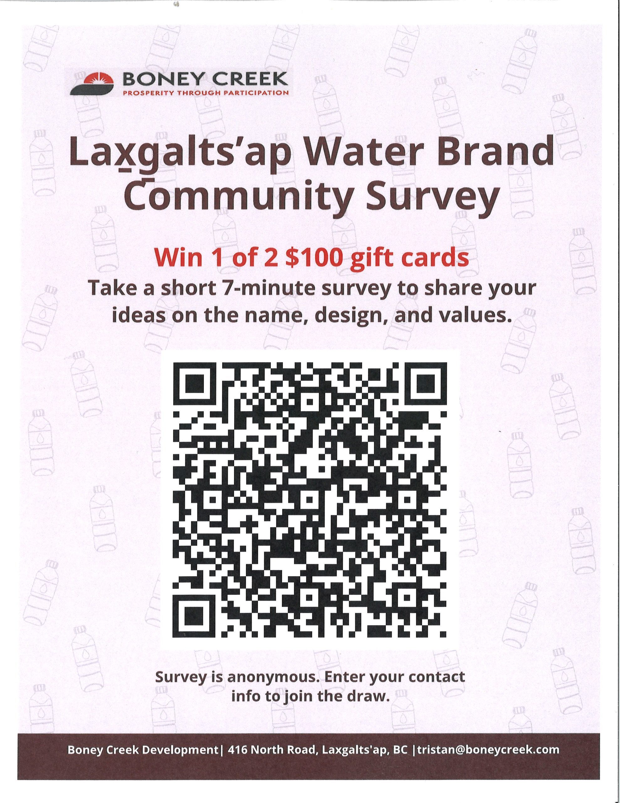 Boney Creek Development is exploring the opportunity to market Laxgalts’ap water through a Nisga’a water bottling brand. Before we move forward, your voice matters most.